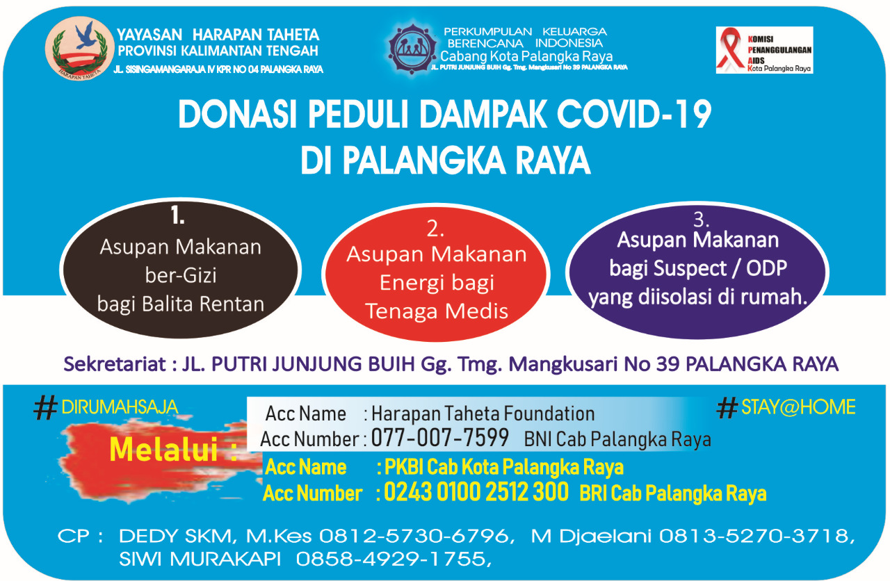 Yayasan Harapan Taheta bersama dengan PKBI Cabang kota Palangka Raya dan KPA kota Palangka Raya menggalang donasi peduli dampak COVID-19. Teman, saudara dimanapun berada mohon dukungan dan bantuannya men DONASI kan untuk membantu saudara2 kita sesuai leaflet yang ada, minimal bantu sebarkan leaflet ini. Tuhan memberkati seluruh dukungan dan bantuan anda.