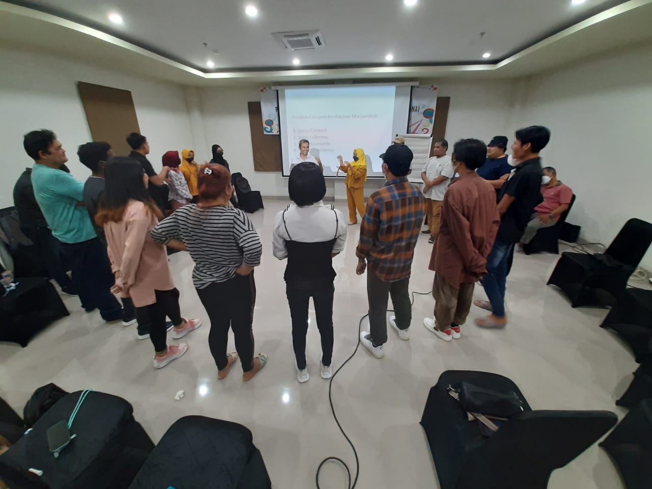 Dalam pertemuan ini tidaknya mendengarkan secara teori saja akan tetapi para peserta di ajak untuk mensimulasikan pengetahuan yang telah di dapat sesuai dengan tujuan pelatihan secara partisipatif. Dan pelatihan ini pun di selingi dengan game education agar para peserta mengerti makna pembentukan kelompok.